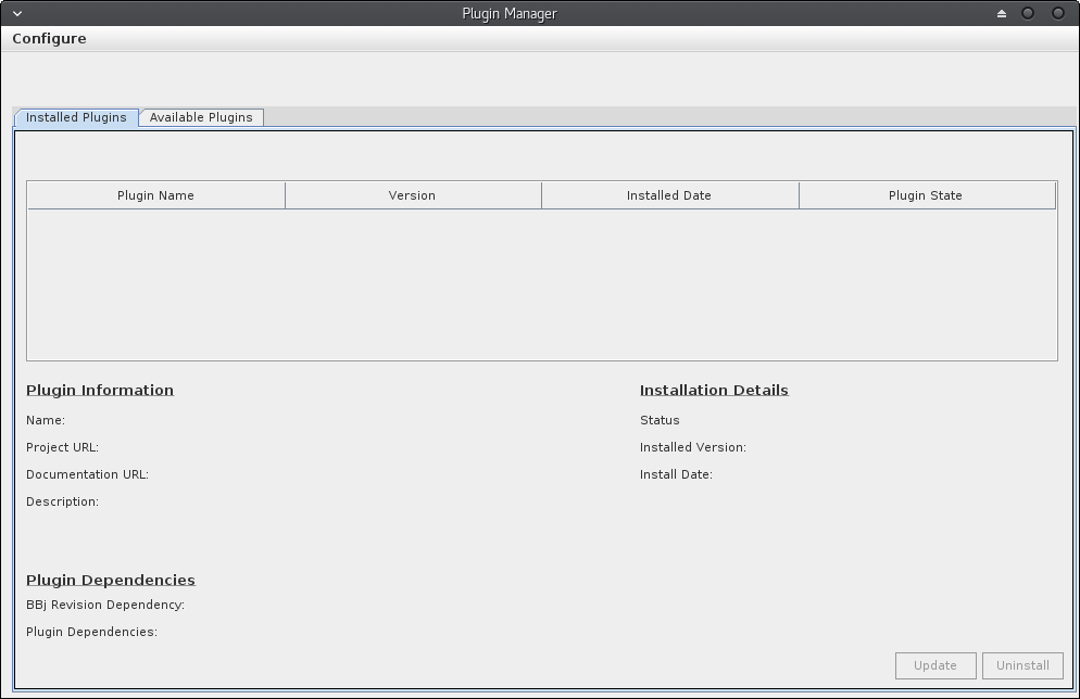 When this launcher script is executed, it will then install the Plug-ins Manager in the <bbj_home>/plugins/ directory and immediately launch it. You should then see something like this: