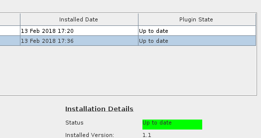 After the plug-in has been installed, its state in the grid will change to "Installed", and the plugin will then be displayed in the "Installed Plugins" tab as well.